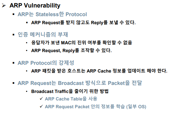 - ARP는 'IP를 모른다'에서 시작함 - 응답 메시지를 보고 확인하여 인증할 방법이 없다.