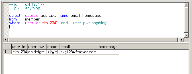 where user_id='ckh1234'--and user_pw='anything'
